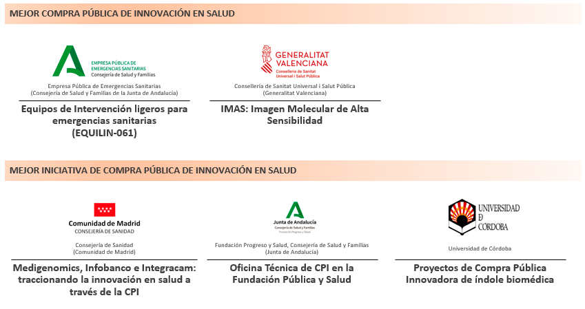La empresa pública de Emergencias Sanitarias andaluza competirá con la Consellería de Sanitat Universal i Salut Pública valenciana en la categoría de Mejor Compra Pública de Innovación en Salud. Y, por otro lado, la consejería de Sanidad de la Comunidad de Madrid, la Fundación Progreso y Salud, de la Junta de Andalucía, y la Universidad de Córdoba lo harán por la Mejor iniciativa de Compra Pública de Innovación en Salud.