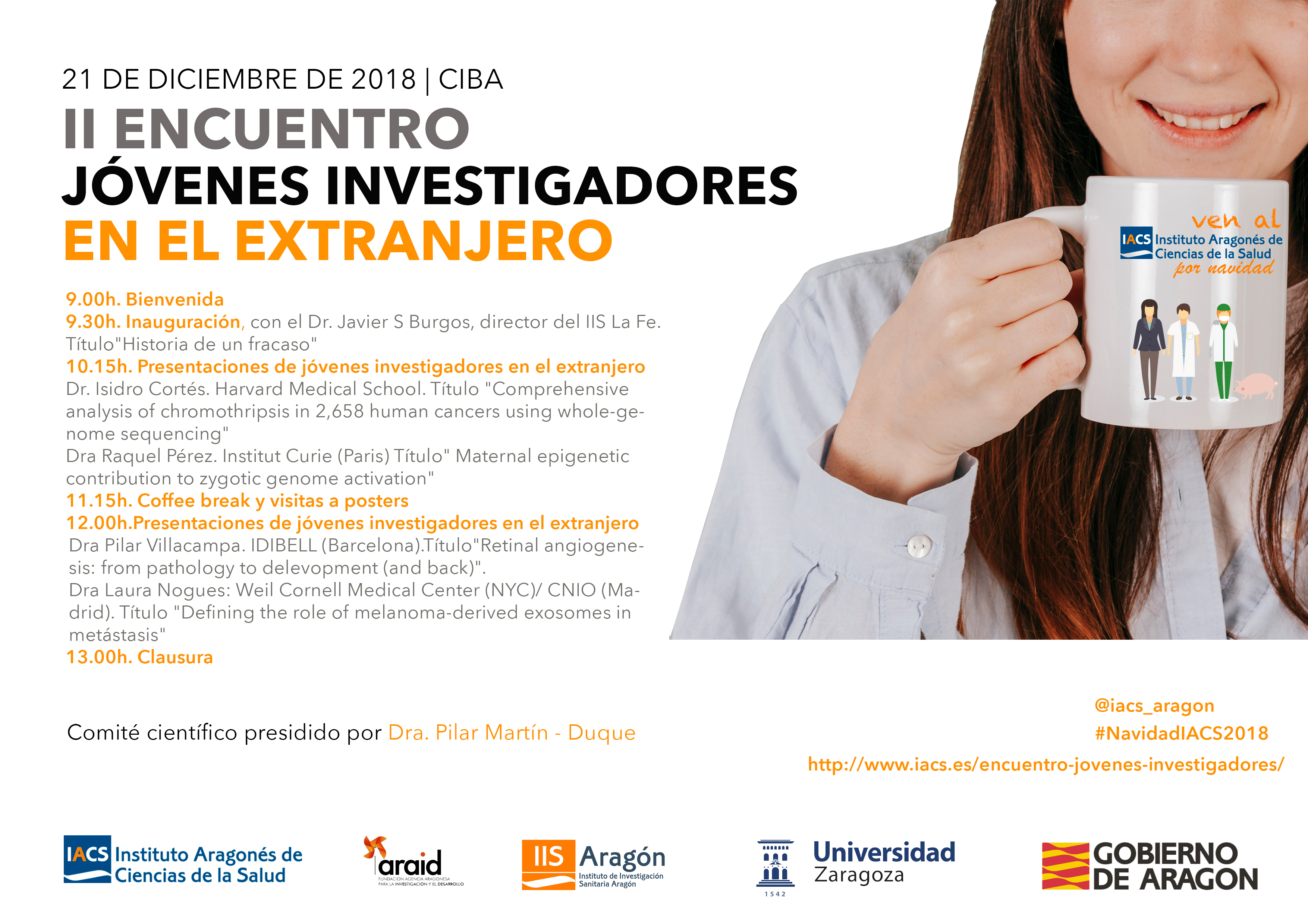 Zaragoza, 10 de diciembre de 2018.- En qué están trabajando los jóvenes investigadores españoles que forman parte de los equipos de centros tan reputados como Harvard Medical School o el Institut Curie de París es una de las preguntas que se responderán el próximo 21 de diciembre en Zaragoza. El Instituto Aragonés de Ciencias de la Salud organiza, por segundo año consecutivo, el Encuentro de Jóvenes Investigadores en el extranjero al que está invitada toda la comunidad científica y que pone el foco de atención en la captación y recuperación del talento.