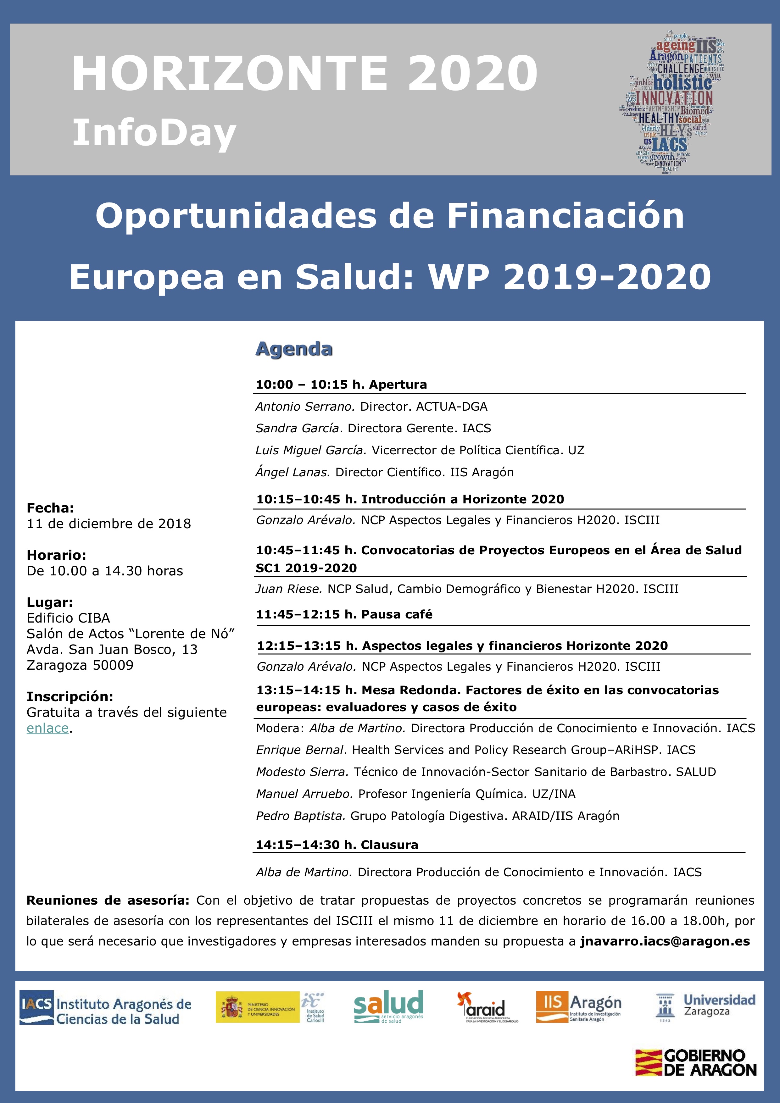 El Instituto Aragonés de Ciencias de la Salud (IACS), junto con el Instituto de Salud Carlos III (ISCIII), organizan la Jornada Informativa «Oportunidades de Financiación Europea en Salud: WP 2019-2020» (se adjunta agenda). La jornada tendrá lugar el 11 de diciembre, de 10h a 14.30h, en el salón de actos «Lorente de Nó» del CIBA (Avª San Juan Bosco 13).