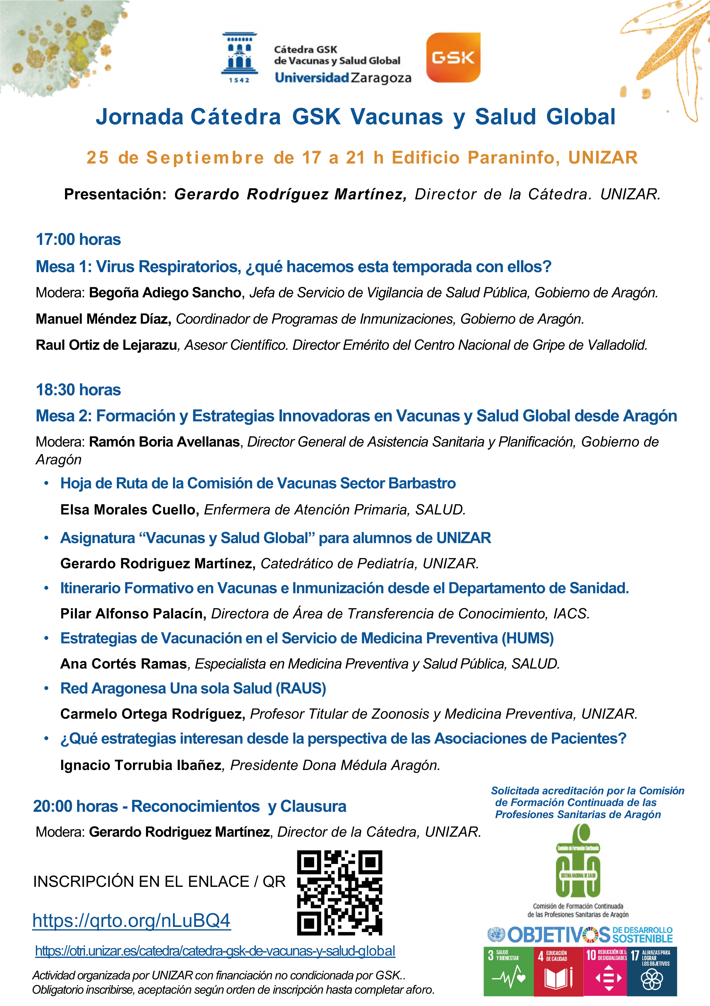 El Instituto Aragonés de Ciencias de la Salud (IACS) participará en la Jornada Cátedra GSK Vacunas y Salud Global. Será el próximo 25 de septiembre de 17 a 21 horas en el Edificio Paraninfo de la Universidad de Zaragoza.