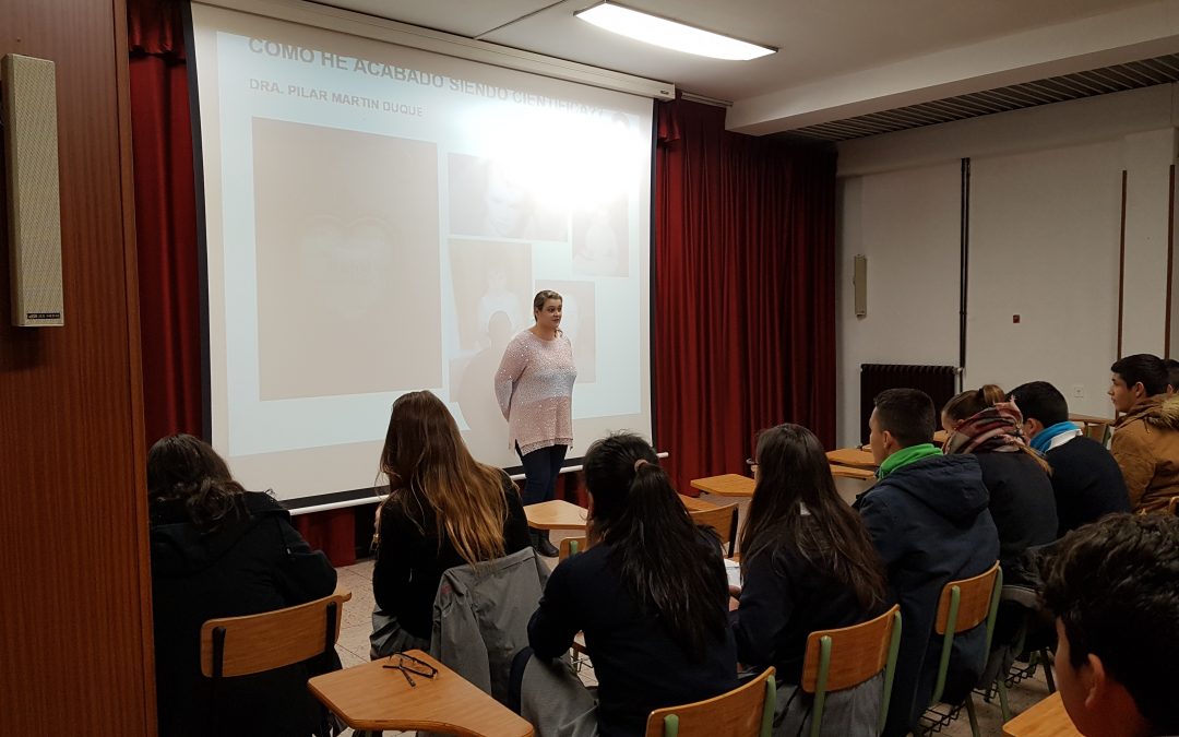 Zaragoza, 15 de febrero del 2018.- “Que las trabas os las pongan los demás, no os las pongáis vosotros”. Es el consejo de Pilar Martín-Duque, investigadora del Instituto Aragonés de Ciencias de la Salud (IACS), a los alumnos de la ruta escolar del IACS para difundir la ciencia y promover vocaciones investigadoras, especialmente entre las niñas en el marco de la Semana de la Mujer y la Niña en la Ciencia.