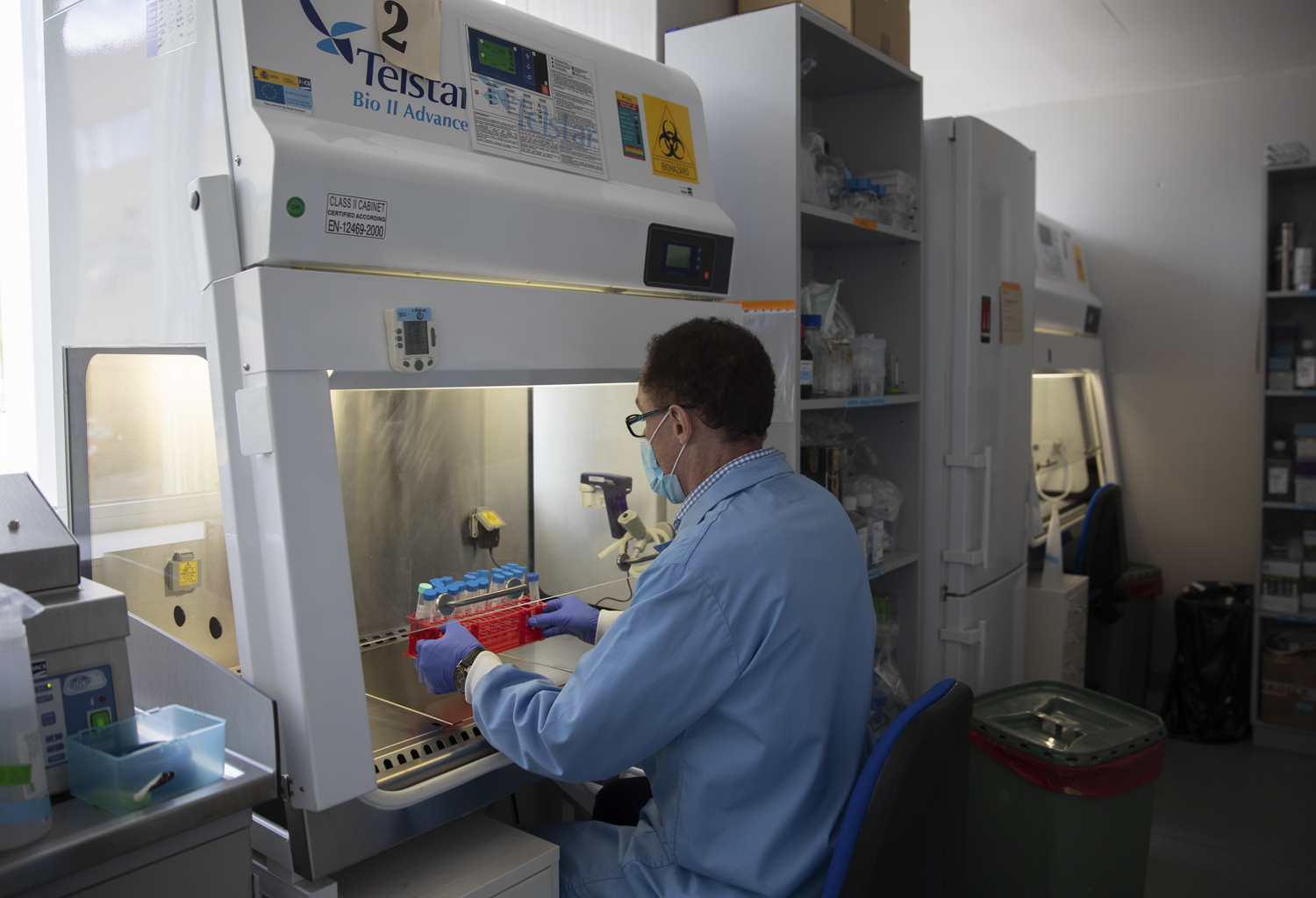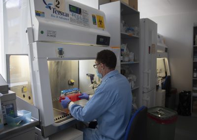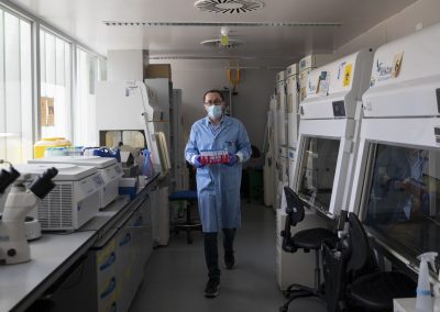 - Cabinas de Bioseguridad nivel II, centrífugas refrigeradas, baños de agua, electroporador, ultracongeladores y tanques de Nitrógeno Líquido en laboratorio con atmósfera controlada.