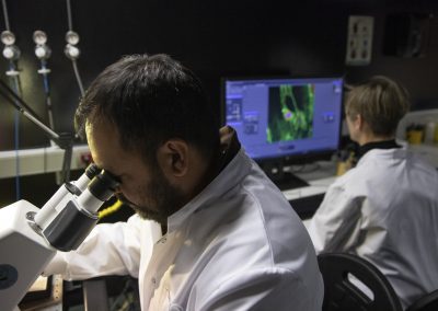 El microscopio confocal espectral Zeiss LSM880 permite la adquisición de imágenes fluorescentes multicanal en muestras vivas. El detector espectral junto con la aplicación del software “spectral unmixing” permiten separar la información espectral de los fluorocromos superpuestos en tiempo real, siempre que estén disponibles los espectros de referencia para cada uno de los fluoróforos individuales. El detector espectral también se puede utilizar para imágenes convencionales de fluorescencia multicanal. La alta sensibilidad del detector permite la detección de señales fluorescentes débiles mientras se emplean bajos niveles de iluminación láser. Por otro lado, el sistema de incubación permite mantener las muestras vivas en las condiciones de temperatura, humedad y CO2/O2 adecuadas para cada tipo celular.