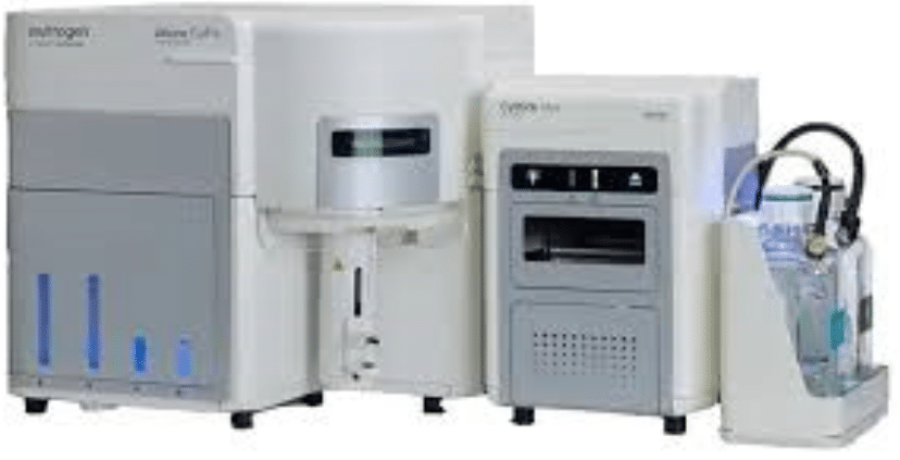 Citometro analizador con 3 láseres 405, 488 y 635 nm, posibilidad de medir simultáneamente 12 parámetros (10 fluorescencias y dispersión frontal y lateral) permite toma de muestra desde un carrusel automatizado