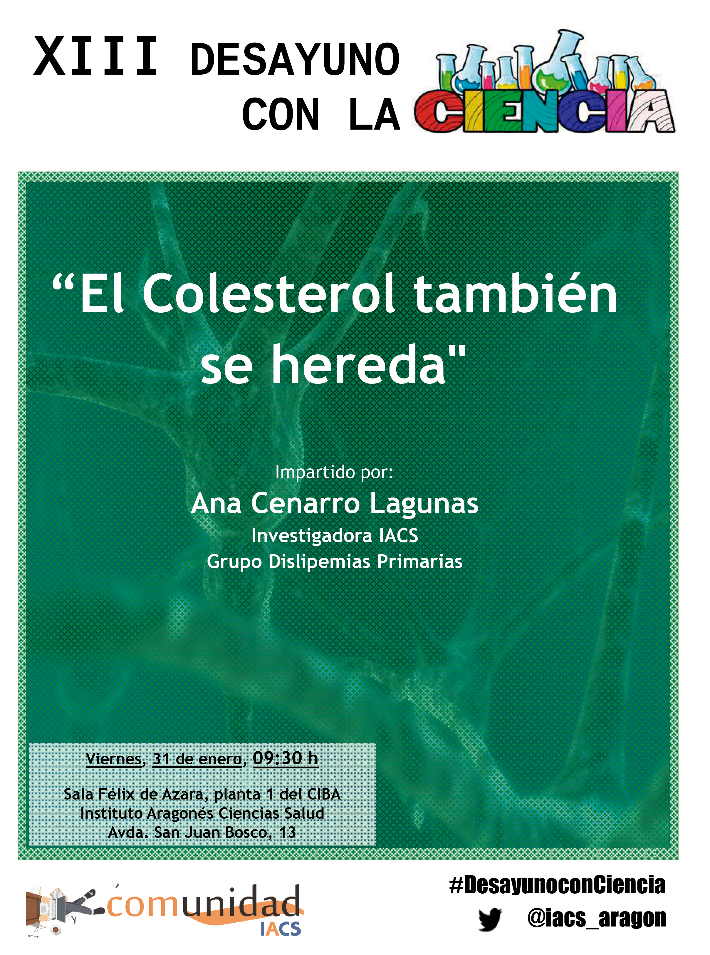 30 de enero 2020.- Ana Cenarro, investigadora principal del grupo de investigación sobre dislipemias primarias del Instituto Aragonés de Ciencias de la Salud, ha compartido una charla en el IACS bajo el nombre «El colesterol también se hereda», en la primera edición de los Desayunos con la Ciencia del año 2020.